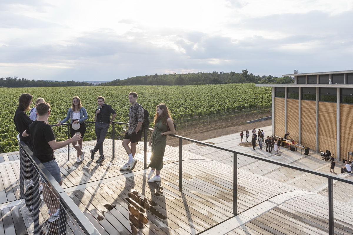Malá poznámka – současná vinařství mají dvě funkce. První funkce je technologická, kde klasickou potravinářskou výrobu řídí sklepmistr, dnes mj. za pomoci počítače. Kvalitní vína lze vyrábět nejen v esteticky dokonalé stavbě. Druhou funkcí je marketingová strategie prodeje vín přímo na místě jejich pěstování a zpracování. Tato zážitková turistika je v současnosti hlavním atributem staveb ikonických vinařství od předních světových architektů. Někdo vinařství rozšiřuje o galerie výtvarného umění, někdo je spojuje s gastronomickými centry nebo s ubytovacím zařízením (viz např. resort Loisium v nedalekém Langenlois v oblasti dolnorakouského údolí řeky Kamp). Vždy záleží na zadání investora a stavebním programu. A také na geniu loci dané lokality, se kterou by měl tvůrce vést citlivý dialog. Zářným příkladem je vinařství Sonberk od Josefa Pleskota. Vrch Slunečná v Popicích, kde tato stavba stojí, má samozřejmě jiný geomorfologický potenciál a Sonberk produkuje pouhý zlomek vín oproti produkci Lahoferu. Z těchto důvodů museli architekti Chybík+Krištof pracovat s velkým stavebním objemem, který se složitěji komponuje do původní krajiny. Přiznám se, že osobně inklinuji k menším vinařstvím právě typu Sonberk. Zvolené místo pro Vinařství Lahofer může návštěvník vnímat pozitivně především v okamžiku, kdy vystoupá na vyhlídkové plato na střeše administrativního a degustačního objektu. Výhled na Pálavu má své kouzlo. Otázkou je, kdy se z něj bude návštěvník těšit. Během horkých a pro Znojemsko typických dní je příjemnější sedět uvnitř betonové skořepiny, která se však zase přehřívá přes skleněnou jižní fasádu. Během příjemného podzimního podvečera nemusí být posezení v degustačním objektu špatný zážitek. Ale ve slunných dnech se ikonická vlna à la jachtařský klub a centrum mládeže v Kodani (architekti Julien de Smedt a Bjarke Ingels / PLOT, 2004), navazující na dvě montované výrobní haly, nejeví jako provozně ideální. Vzniklé auditorium či amfiteátr a vyhlídková plošina jsou také vhodné především pro podvečerní nebo večerní kulturně-společenské aktivity.