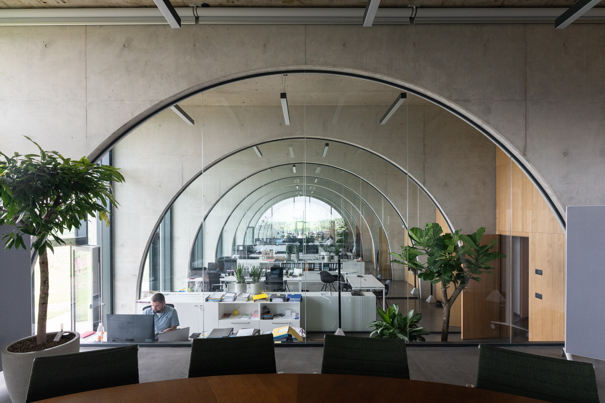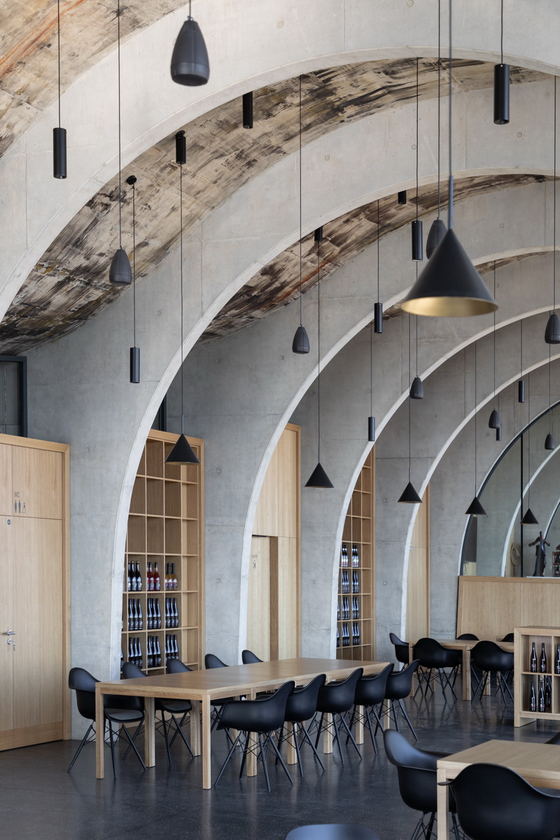 Prostor pro degustace je krytý betonovou skořepinou vynesenou obloukovými žebry. Stejně velkoryse je řešeno i administrativní zázemí, kam je možné nahlížet. Návštěvník díky tomu nepřijde o možnost vnímání celého velkolepého prostoru. V procesu se architekti rozhodli oslovit výtvarníka Patrika Hábla a místo akustického podhledu ho nechali vytvořit obrovskou malbu na celou skořepinu. Akustika sice utrpěla, ale celkový zážitek to umocnilo.