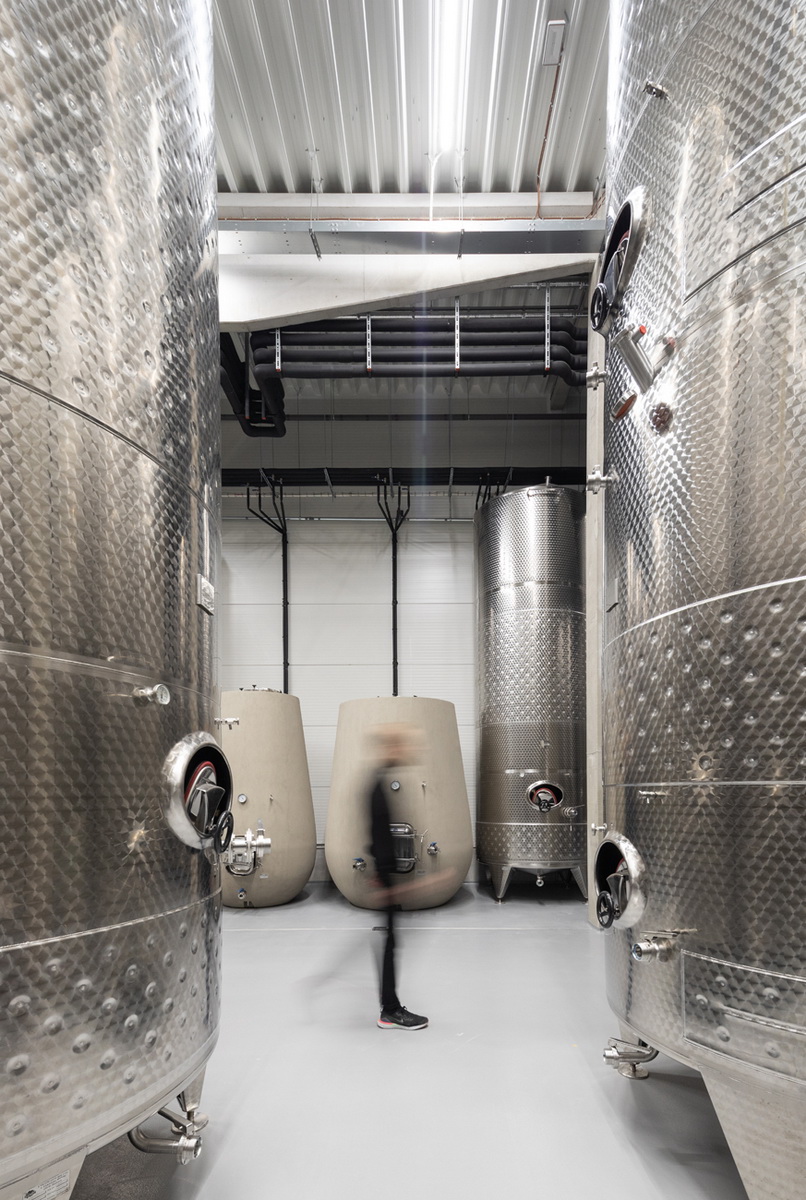 Jak bychom tedy měli číst objekt Vinařství Lahofer? V měřítku velkého vinařství musíme zapomenout na romantiku a pitoresknost obrazů vinařských uliček, kládových lisů a valených sklípků. Proces zpracování hroznů musí být rychlý, efektivní a v kontrolovaném prostředí. Čím kratší je doba transportu hroznů, tím lépe. Moderní vinařství je v podstatě průmyslový provoz a tomu odpovídají i měřítko a typologie moderních vinařství. Pro architekty to znamená vypořádat se s rozsáhlým stavebním programem a komplikovaným provozem. Chybík+Krištof se rozhodli, že vinařství rozčlení do několika hmot – výrobní část představuje efektivní montovaná betonová konstrukce, reprezentativní část tvoří betonový monolit. Architekti se tak úspěšně vypořádali s tím, že celek nepůsobí gigantickým dojmem, zároveň se však vyhýbají pitoresknosti – objekt je primárně výrobní halou a to se zde přiznává. Reprezentativní část je lehce vytočená vůči hale a při příchodu ji celou zakrývá. Je jasně rozlišen přístup návštěvníků a hroznů.