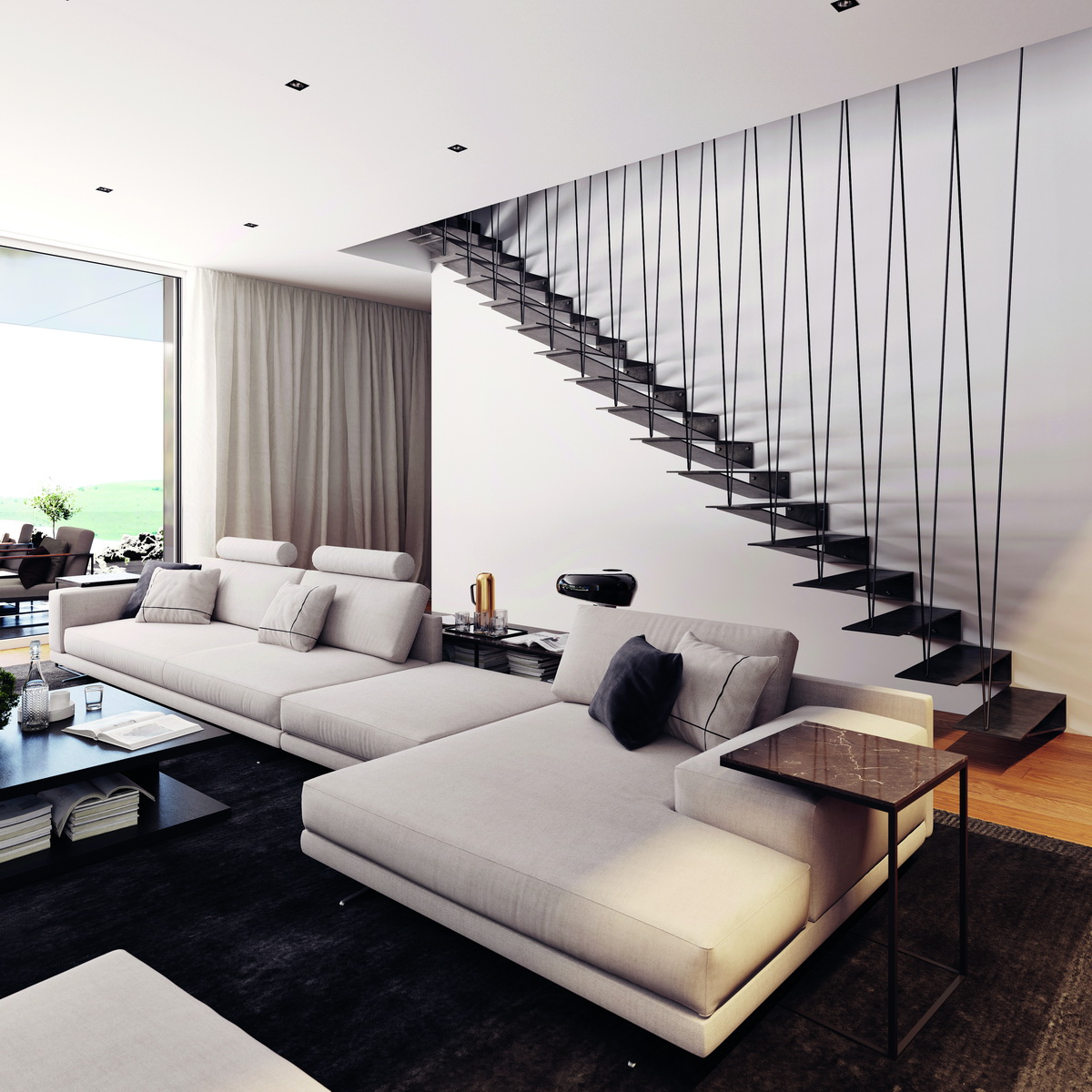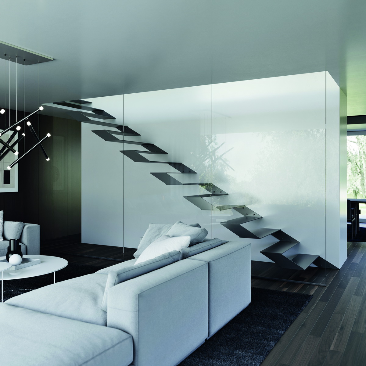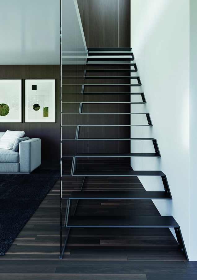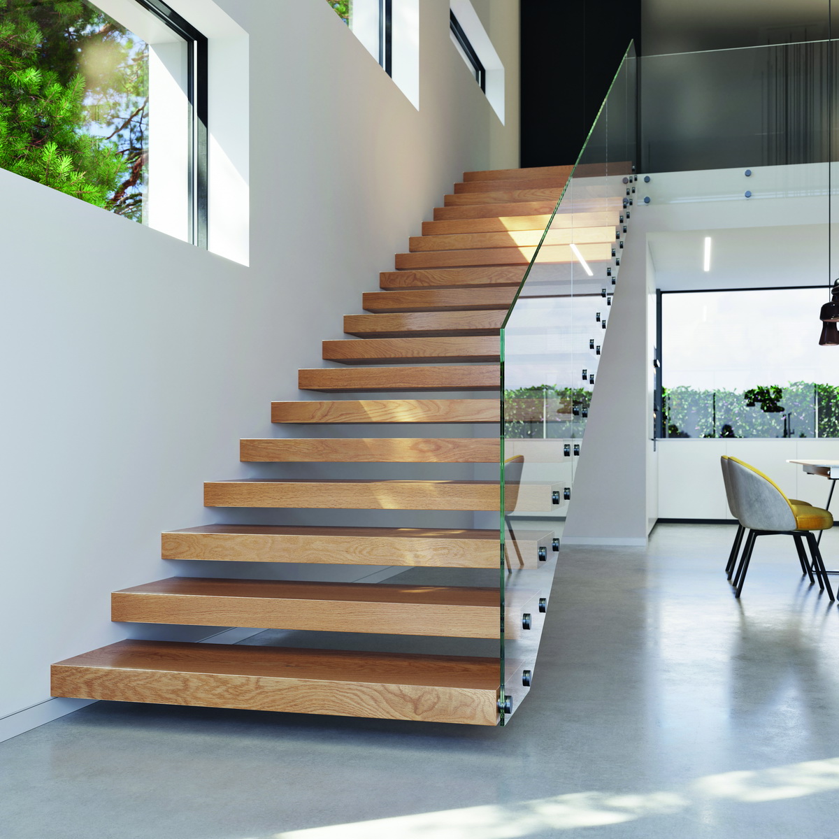 Za efektem levitujícího schodiště tedy stojí především způsob ukotvení jednotlivých nášlapů, které je navíc možné doplnit podstupnicemi. Celkový vzdušný dojem ještě podtrhne nadčasové zábradlí vyrobené z čirého skla.