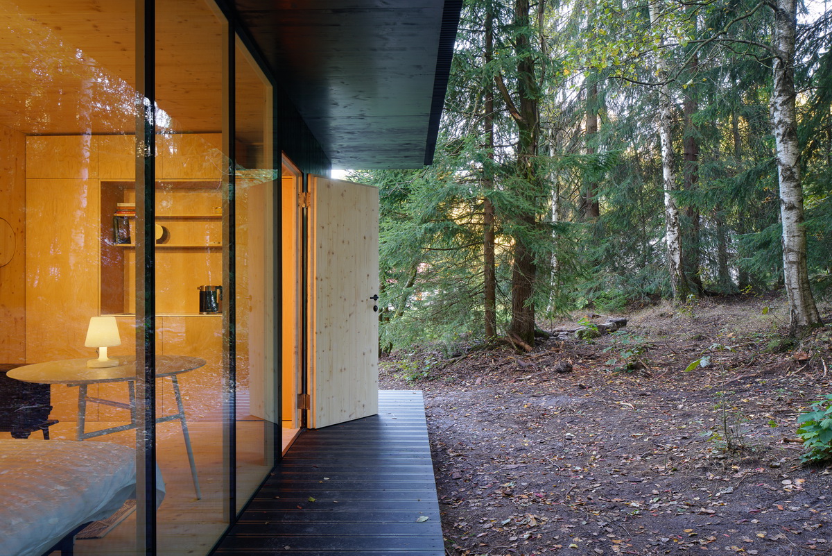 V hlavní prosklené části, která nabízí výhled do okolní krajiny, se nachází obytný prostor s postelí, kuchyní z deskového materiálu DTD s povrchovou jasanovou dýhou a kamny. Součástí rámu zasklení je skrytá garnýž, která však umožňuje kdykoliv v interiéru chatky vytvořit soukromí. Plná stěna pak skrývá toaletní kapsli se záchodem i sprchou a dále technickou místnost přístupnou samostatným vstupem zvenčí.